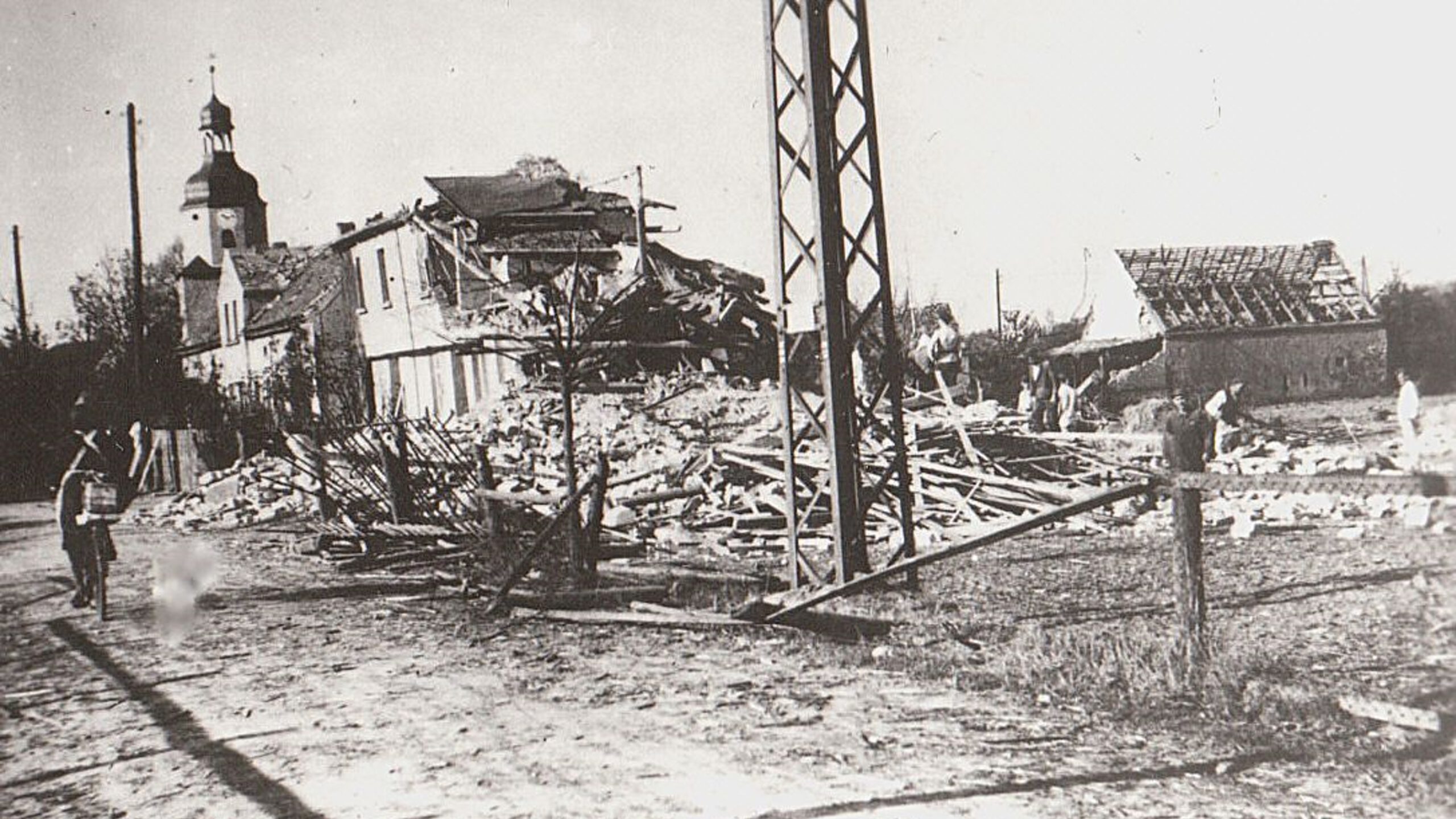„An diesem Abend, zwischen 19 und 20 Uhr, war ein ununterbrochenenes Dröhnen von Flugzeugen zu hören. Die Bewohner unserer Straße begaben sich auf die Straße und es war allen klar, dass es sich um feindliche Flugzeuge handelte. Zum Überlegen blieb keine Zeit, denn es fielen schon Sprengbomben. Durch den ungeheuren Luftdruck wurden Fenster und Türen samt Rahmen aus den Mauern gerissen, Dächer ausgehoben und abgedeckt. Die Bewohner unseres Hauses versuchten, den Ort in Richtung Windmühlenberg/Schäferei zu verlassen. Hinter der Mühle lagen wir in einem Kleefeld, hatten den Ort im Tal direkt vor uns im Blickfeld. Nach den Sprengbomben kamen die Brandbomben. Immer mehr Brände flackerten im Dorf auf. Zwei Scheunen brannten total ab. Auch an Wohnhäusern brannten Dachstühle, die umgehend gelöscht wurden. Nach dem Abflug des Pulks sind wir zurück ins Dorf. Die Schäden waren enorm. Es gab kein Haus, das unversehrt geblieben war. Die schwersten und schlimmsten Schäden waren am Dahlener Weg. Dort befanden sich zwei Wohnblocks mit je drei Wohnungen, sogenannte Drescherhäuser (Arbeiterwohnungen des Rittergutes Sachsendorf). Die dritte Wohnung im letzten Block war die von Familie Hanisch: von Ernst und Ida Hanisch mit dem fünfjährigen Sohn bewohnt. Einige Bewohner dieser Straße suchten Schutz auf der gegenüberliegenden Seite hinter hohen Mauern der Wirtschaftsgebäude eines Bauernhofes. Familie Hanisch wollte noch etwas Wichtiges aus der Wohnung holen und alle drei liefen nochmals über die Straße in ihr Haus. In diesem Moment kam die Luftmine und das Haus war ein einziger Schuttberg.